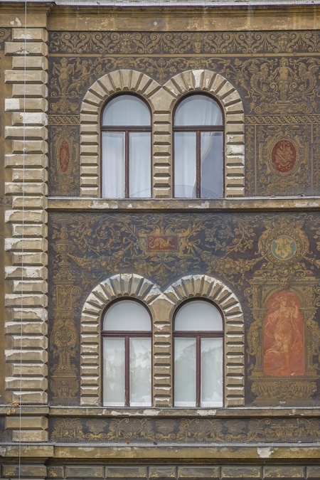 Hungary, Budapest, Old and beautiful painted building facade in Kodaly Korond circus square, Credit:Fabio Mazzarella / Avalon