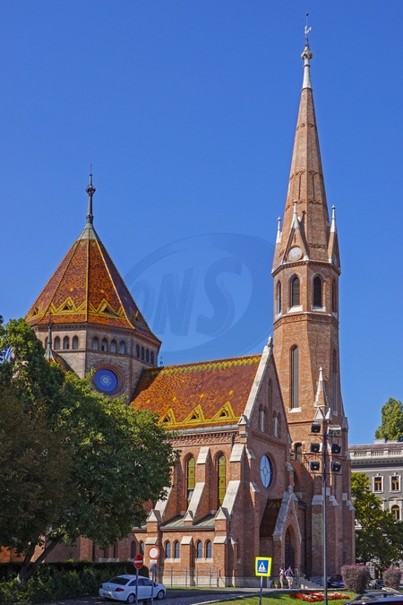Hungary, Budapest, Boat passing before the neo-gothic Calvinist Church of Szilagyi Dezso ter, Reformatus Templom, designed by architect Samu Pecz. Its roof is covered in Zsolnay glazed tiles in brown, yellow and greenPhoto © Fabio Mazzarella/Sintesi *** Local Caption ***, Credit:Fabio Mazzarella / Avalon