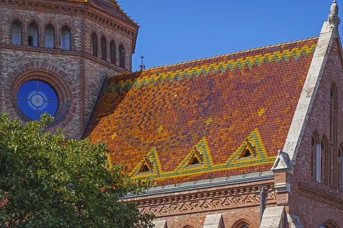 Hungary, Budapest, Boat passing before the neo-gothic Calvinist Church of Szilagyi Dezso ter, Reformatus Templom, designed by architect Samu Pecz. Its roof is covered in Zsolnay glazed tiles in brown, yellow and greenPhoto © Fabio Mazzarella/Sintesi *** Local Caption ***, Credit:Fabio Mazzarella / Avalon