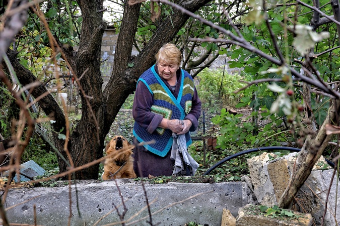 ODESA, UKRAINE - OCTOBER 19, 2024 - A woman and dog are near a building damaged by the October 18 Russian missile strike in Odesa, southern Ukraine., Credit:Nina Liashonok / Avalon
