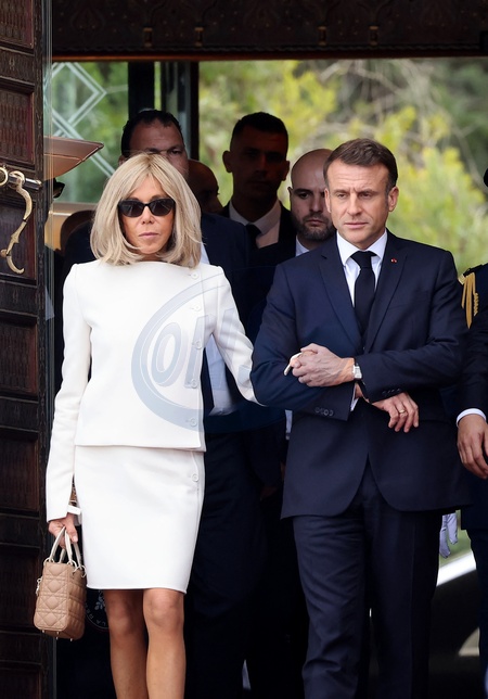 Cérémonie de départ du Président de la Républiquefrançaise Emmanuel Macron et sa femme la Première Dame Brigitte Macron en présence de Aziz Akhannouch, chef du gouvernement du Maroc à l'aéroport de Salé au nord de Rabat le 30 octobre 2024. © Dominique Jacovides/Bestimage French President Emmanuel Macron and his wife First Lady Brigitte Macron at the airport of Sale north of Rabat on October 30, 2024, as the presidential couple prepares to leave Morocco at the end of their visit.