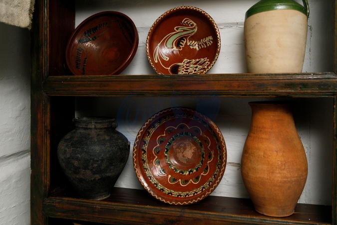 CHERKASY REGION, UKRAINE - OCTOBER 25, 2024 - Clay dishes are on the kitchen rack in the restored house which belonged to Taras Shevchenko's grandfather at the Taras Shevchenko Homeland National Preserve, Cherkasy region, central Ukraine. The Taras Shevchenko Homeland National Preserve unites the villages of Moryntsi, Shevchenkove, Budyshche and Vilshana. These are the places where the famous Ukrainian poet and painter Taras Shevchenko spent his childhood years., Credit:KIRILL CHUBOTIN / Avalon