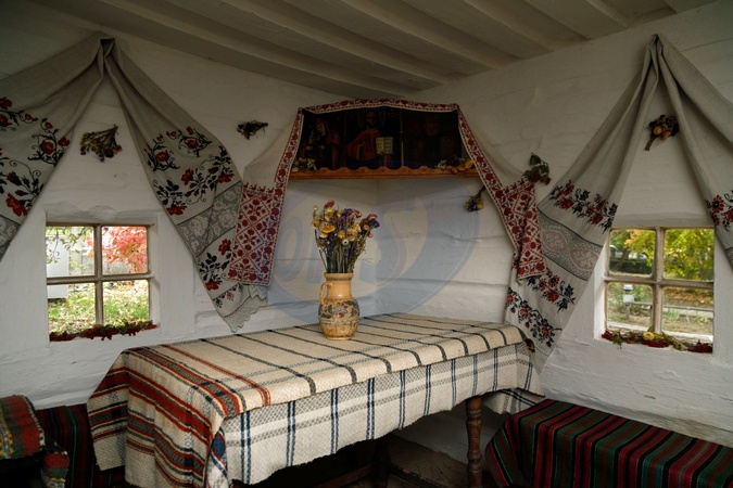 CHERKASY REGION, UKRAINE - OCTOBER 25, 2024 - A table is in the corner of the restored house which belonged to Taras Shevchenko's grandfather at the Taras Shevchenko Homeland National Preserve, Cherkasy region, central Ukraine. The Taras Shevchenko Homeland National Preserve unites the villages of Moryntsi, Shevchenkove, Budyshche and Vilshana. These are the places where the famous Ukrainian poet and painter Taras Shevchenko spent his childhood years., Credit:KIRILL CHUBOTIN / Avalon