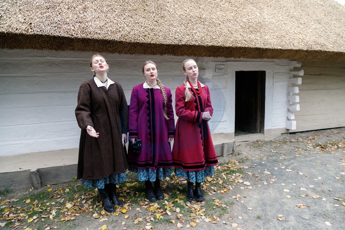 CHERKASY REGION, UKRAINE - OCTOBER 25, 2024 - Three women in folk clothes sing outside one of the restored 19th-century houses at the Taras Shevchenko Homeland National Preserve, Cherkasy region, central Ukraine. The Taras Shevchenko Homeland National Preserve unites the villages of Moryntsi, Shevchenkove, Budyshche and Vilshana. These are the places where the famous Ukrainian poet and painter Taras Shevchenko spent his childhood years., Credit:KIRILL CHUBOTIN / Avalon