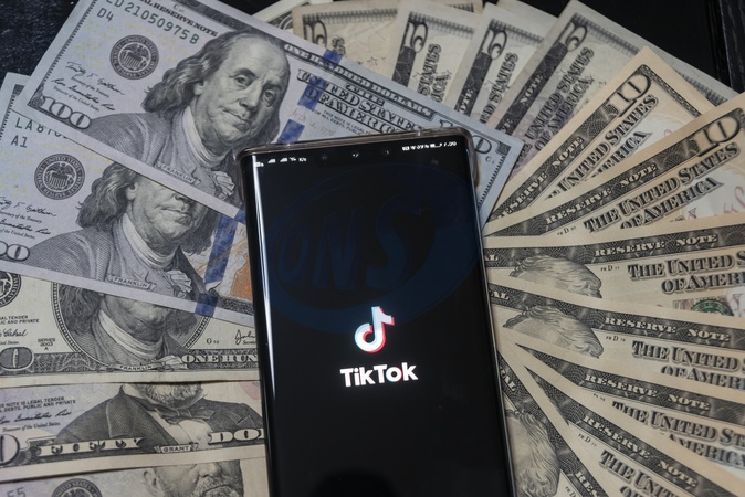A staged view of TikTok and US dollar banknotes., Credit:WANG GANG / Avalon