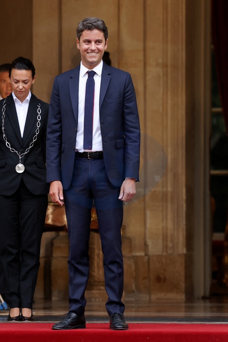 Info - Gabriel Attal, alors ministre de l'Education nationale, a joué son propre rôle dans la série "Askip" (France Télévisions) - Passation de pouvoir entre l'ancien premier ministre Gabriel Attal et le nouveau premier ministre Michel Barnier à l'Hotel de Matignon, Paris, France, le 5 septembre 2024. © Stéphane Lemouton/Bestimage France newly appointed Prime minister Michel Barnier and outgoing Prime minister Gabriel Attal during the handover ceremony at the Hotel Matignon in Paris, France, on September 5, 2024. France's President E.Macron appointed former right-wing minister and European Commissioner Michel Barnier as Prime Minister on September 5, 60 days after the second round of legislative elections that resulted in a National Assembly without a majority.