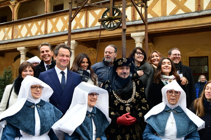 Alain Suguenot, maire de Beaune, Dominic West, Eva Longoria, Jean Reno, Zabou Breitman, Maria Bravo (Fondatrice de la Global Gift Foundation) lors de la 164ème vente des Hospices de Beaune sous les Halles de Beaune le 17 novembre 2024. Cette 164ème édition se tenait comme chaque année sous la Halle de Beaune, en face de l'Hôtel-Dieu. La Pièce de Charité, un Beaune 1er cru "Les Bressandes", a été vendue pour 360.000 euros © Romain Doucelin / Bestimage 164th Hospices de Beaune auction under the Halles de Beaune on 17 November 2024. As in previous years, the 164th Hospices de Beaune auction was held in the Halle de Beaune, opposite the Hôtel-Dieu. The Pièce de Charité, a Beaune 1er cru ‘Les Bressandes', sold for €360,000.
