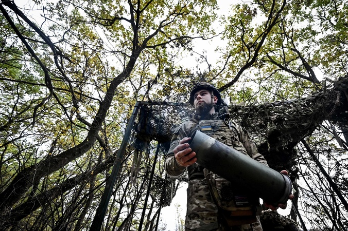 DONETSK REGION, UKRAINE - OCTOBER 25, 2024 - An artilleryman of the Khyzhak Patrol Police Special Unit holds an artillery shell case while on a combat mission at the positions in Donetsk region, eastern Ukraine., Credit:Dmytro Smolienko / Avalon
