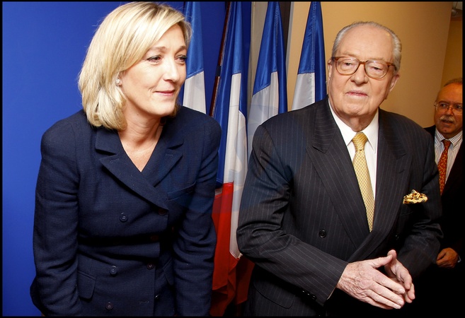 C'EST ENTOURE DE SA FILLE MARINE LE PEN, QUE JEAN MARIE LE PEN PRESENTE SES DERNIERS VOEUX A LA PRESSE EN TANT QUE PRESIDENT DU FRONT NATIONAL (FN)