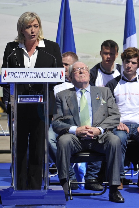 MARINE LE PEN ET JEAN MARIE LE PEN - TRADITIONNEL RASSEMBLEMENT DU FRONT NATIONAL PLACE DE L'OPERA A PARIS LE 1ER MAI 2012. French far right party Front National (FN) former presidential candidate Marine Le Pen and French far right party Front National (FN) honour president, Jean-Marie Le Pen deliver a speech as part of the FN's annual celebration on May 1, 2012 in Paris. Anti-immigrant FN's, Marine Le Pen knocked out in the April 22 first round after scoring a record 18 percent of votes, held her own rally in Paris in memory of far-right icon Joan of Arc (Jeanne D'Arc).