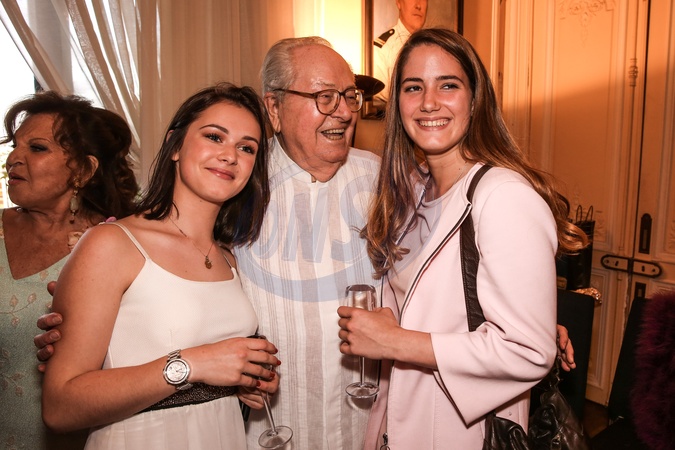 Exclusif - Prix spécial - No Web - Jean-Marie Le Pen avec ses petites-filles Mathilde Chauffroy et Jehanne Chauffroy, les filles de Marine Le Pen - Jean-Marie Le Pen fête ses 88 ans au manoir de Montretout avec sa famille et de nombreux amis à Saint-Cloud le 25 juin 2016. Exclusive - For Germany please call for price No web No Blog en Suisse Belgique Jean-Marie Le Pen celebrates his 88 years at Montretout mansion with his family and many friends at St. Cloud June 25, 2016