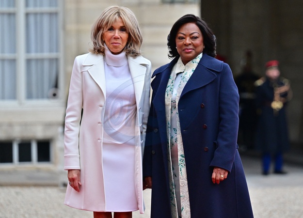 Le couple présidentiel français Emmanuel et Brigitte Macron accueille leurs homologues de la République d'Angola João et Ana Dias Lourenço au palais présidentiel de l'Élysée, à Paris le 16 janvier 2025. Le couple présidentiel de la République d'Angola est en visite d'etat les 16 et 17 janvier en France. © Christian Liewig/Bestimage French presidential couple Emmanuel and Brigitte Macron welcome their counterparts from the Republic of Angola João and Ana Dias Lourenço at the Élysée presidential palace in Paris on January 16, 2025. The presidential couple from the Republic of Angola are on a state visit to France on January 16 and 17.