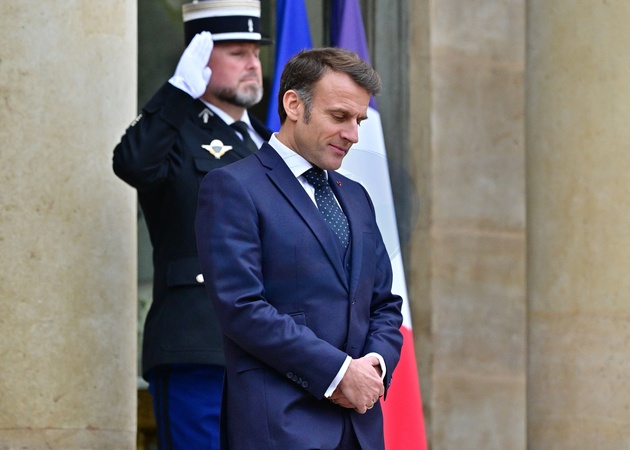 Prezydent Republiki Francuskiej Emmanuel Macron przyjmuje kanclerza Niemiec Olafa Scholza na roboczym obiedzie w Pałacu Elizejskim w Paryżu