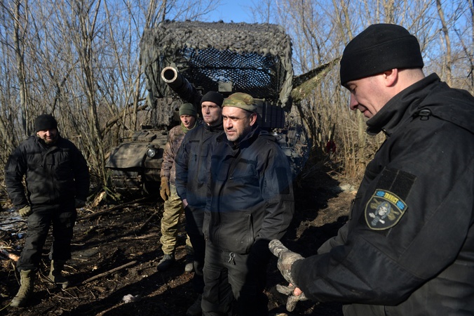 DONETSK REGION, UKRAINE - FEBRUARY 9, 2025 - Soldiers stay by a tank as the 1st Tank Battalion of Ukraine's 5th Heavy Mechanized Brigade equipped with Leopard 1A5 tanks serves in Kurakhove and Pokrovsk directions, Donetsk region, eastern Ukraine. (Photo by Oleksandr Klymenko/Ukrinform), Credit:Oleksandr Klymenko / Avalon