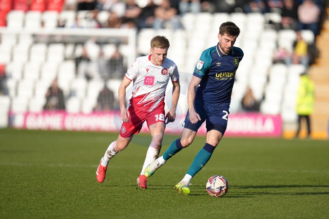 Antony Evans of Huddersfield Town plays the ball under pressure from Harvey White of Stevenage during the Sky Bet League 1 match Stevenage vs Huddersfield Town at Lamex Stadium, Stevenage, United Kingdom, 1st March 2025, Credit:Harvey Murphy/News Images / Avalon