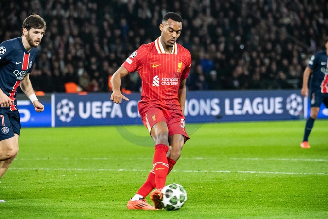 Ryan Gravenberch (FC Liverpool) - 1/8e de finale aller de la Ligue des champions 2024-25 entre le PSG contre Liverpool (0-1) au Parc des Princes à Paris le 5 mars 2025. 1/8th final first leg of the 2024-25 Champions League between PSG against Liverpool (0-1) at the Parc des Princes in Paris on March 5, 2025.