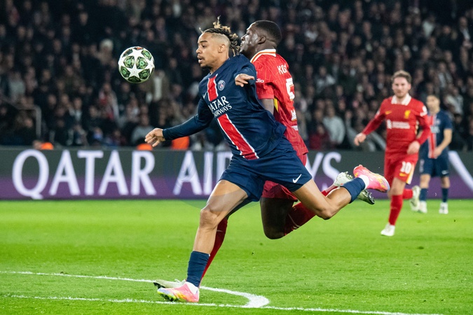 Bradley Barcola (Paris SG) Ibrahima Konaté (FC Liverpool) - 1/8e de finale aller de la Ligue des champions 2024-25 entre le PSG contre Liverpool (0-1) au Parc des Princes à Paris le 5 mars 2025. 1/8th final first leg of the 2024-25 Champions League between PSG against Liverpool (0-1) at the Parc des Princes in Paris on March 5, 2025.