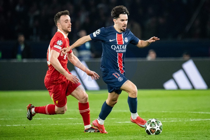 Vitinha (Paris SG) Diogo Jota (FC Liverpool) - 1/8e de finale aller de la Ligue des champions 2024-25 entre le PSG contre Liverpool (0-1) au Parc des Princes à Paris le 5 mars 2025. 1/8th final first leg of the 2024-25 Champions League between PSG against Liverpool (0-1) at the Parc des Princes in Paris on March 5, 2025.