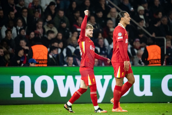 Joie des joueurs du FC Liverpool aprés le but de Harvey Elliott (FC Liverpool) - 1/8e de finale aller de la Ligue des champions 2024-25 entre le PSG contre Liverpool (0-1) au Parc des Princes à Paris le 5 mars 2025. 1/8th final first leg of the 2024-25 Champions League between PSG against Liverpool (0-1) at the Parc des Princes in Paris on March 5, 2025.