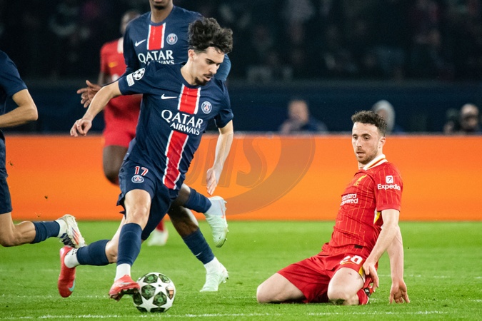 Diogo Jota (FC Liverpool) Vitinha (Paris SG) - 1/8e de finale aller de la Ligue des champions 2024-25 entre le PSG contre Liverpool (0-1) au Parc des Princes à Paris le 5 mars 2025. 1/8th final first leg of the 2024-25 Champions League between PSG against Liverpool (0-1) at the Parc des Princes in Paris on March 5, 2025.