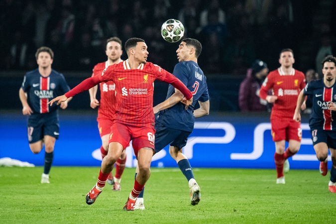 Trent Alexander-Arnold (FC Liverpool) Achraf Hakimi (Paris SG) - 1/8e de finale aller de la Ligue des champions 2024-25 entre le PSG contre Liverpool (0-1) au Parc des Princes à Paris le 5 mars 2025. 1/8th final first leg of the 2024-25 Champions League between PSG against Liverpool (0-1) at the Parc des Princes in Paris on March 5, 2025.