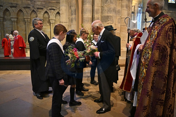DURHAM, ENGLAND - APRIL 17: King Charles III meeting people involved in the service after the Royal Maundy Service at Durham Cathedral on April 17, 2025 in Durham, England. The King presented the Maundy recipients, 76 men and 76 women with two purses: one red and one white, containing Maundy Money. The white purse held specially minted silver Maundy coins. This year, the red purse contained a ÂŁ5 coin commemorating The Queen Mother and a 50p coin featuring WWII stories. The Royal Maundy gifts recognised the recipients' exceptional Christian service and their contributions to their local communities., Credit:Anthony Devlin / Avalon