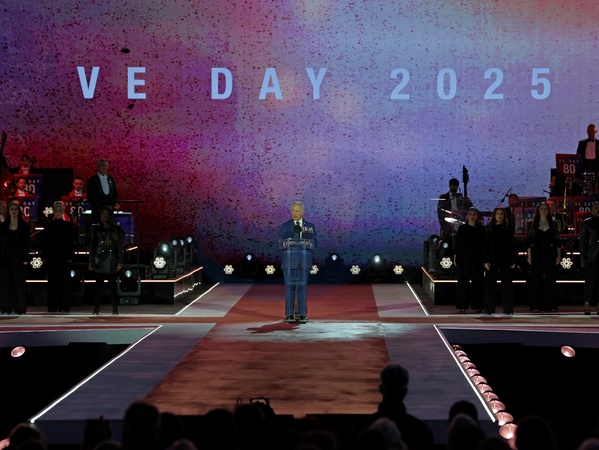 LONDON, ENGLAND - MAY 08: King Charles III speaks on stage during a concert to mark the 80th Anniversary of VE Day at Horse Guards Parade on May 08, 2025 in London, England. The King and Queen, joined by Members of the Royal Family, will take part in events from May 5th to May 8th to commemorate the 80th anniversary of VE Day, which signalled the end of the Second World War in Europe., Credit:Chris Jackson / Avalon