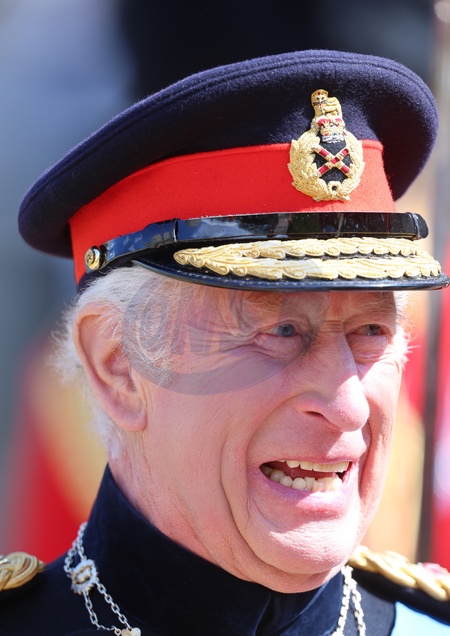 WINDSOR, ENGLAND - MAY 12: King Charles III laughs during the presentation of the New Standards at Windsor Castle on May 12, 2025 in Windsor, England. The King, accompanied by The Princess Royal, will attend the Household Cavalry's New Standards Parade at Windsor Castle on Monday, 12th May. The Standards, deeply symbolic of the Squadrons' heritage and achievements, are held in the highest esteem., Credit:Chris Jackson / Avalon