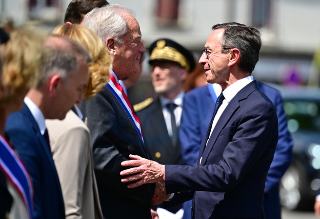 Bruno Retailleau i Nicolas Sarkozy podczas hołdu Aurélie Fouquet w Villiers-sur-Marne