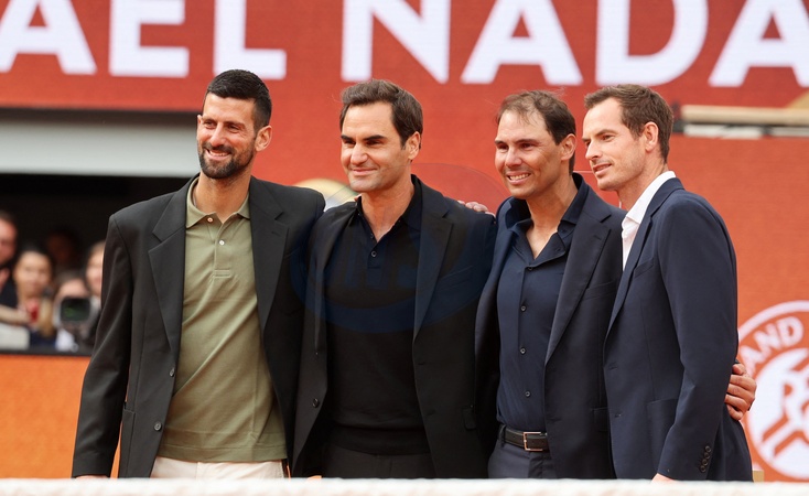 Novak Djokovic, Roger Federer, Rafael Nadal, Andy Murray - Hommage à Rafael Nadal lors des internationaux de France de tennis à Rolnd Garros le 25 mai 2025. © Dominique Jacovides / Cyril Moreau / Bestimage Tribute to Rafael Nadal during the French international tennis tournament at Rolnd Garros on 25 May 2025.