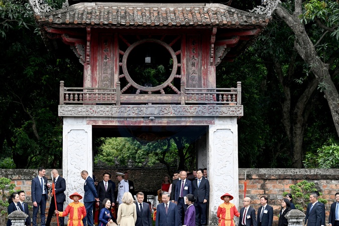 Prezydent Francji Emmanuel Macron i jego żona Brigitte Macron, którym towarzyszą sekretarz generalny Wietnamskiej Partii Komunistycznej To Lam i jego żona Ngo Phong Ly, odwiedzają Świątynię Literatury w Hanoi.