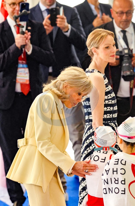 No Tabloïds - La princesse Charlène de Monaco et la Première Dame française Brigitte Macron lors d'un Water Safety Day de la Fondation Princesse Charlène de Monaco à la piscine du Stade Louis II de Monaco, le 8 juin 2025. Le CSAPM a lancé en 2014 le Water Safety Day à Monaco avec le soutien de la Fondation. L'objectif = proposer une journée entière d'activités alliant natation, sécurité aquatique et valeurs du sport aux jeunes de la Principauté. Les Water Safety Days symbolisent les missions d'éducation et de transmission de la Fondation Princesse Charlène de Monaco et mettent en œuvre la vision de S.A.S. la Princesse Charlène. © Claudia Albuquerque/Bestimage No Tabloïds - No Mail Online - Only for Grazia, OK, Hello UK - Water Safety Day at the Louis II stadium swimming pool in Monaco, on June 8th 2025.