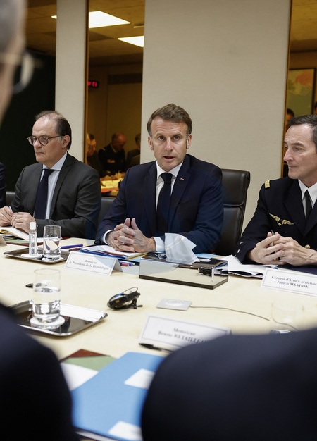 French President Emmanuel Macron flanked by French Presidency General Secretary Emmanuel Moulin and France's General Fabien Mandon attends a national security meeting on the crisis between Israel and Iran in the Jupiter room at the Elysee Palace in Paris, France, June 22, 2025. © Benoit Tessier/Pool/Bestimage