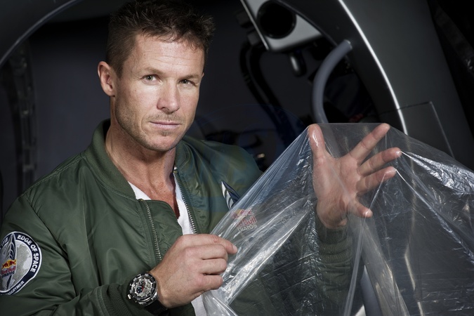 Pilot Felix Buamgartner of Austria shows a piece of the balloon material during the Red Bull Stratos egress training in Lancaster, California, USA on February 23, 2012. 02-00102 Austrian Felix Baumgartner has become the first skydiver to go faster than the speed of sound, reaching a maximum velocity of 833.9mph (1,342km/h).In jumping out of a balloon 128,100ft (24 miles; 39km) above New Mexico, the 43-year-old also smashed the record for the highest ever freefall.He said he almost aborted the dive because his helmet visor fogged up.It took just under 10 minutes for him to descend. Only the last few thousand feet were negotiated by parachute.Once down, he fell to his knees and raised his fists in triumph. Helicopter recovery teams were on hand moments later., Credit:Avalon