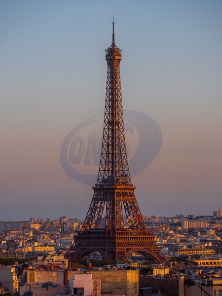Photo de la tour Eiffel prise un soir d'heure dorée depuis le toit de l'Arc de Triomphe, ornée des anneaux olympiques à l'occasion de Paris 2024. © Theo Castillon / Bestimage
