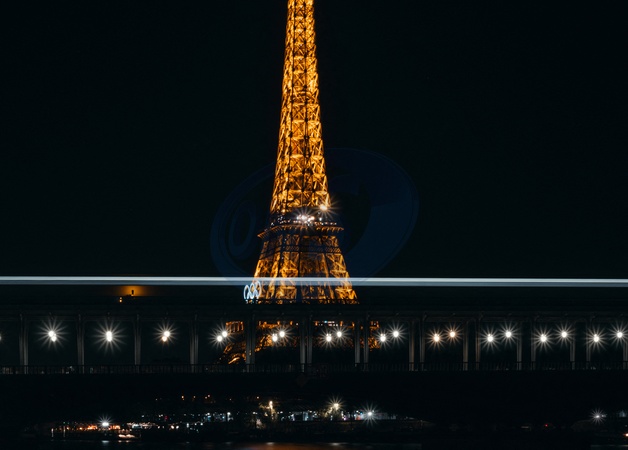 Photo de la tour Eiffel avec le métro qui passe sur le Pont Bir Hakeim prise de nuit en pose longue qui permet de faire apparaître les anneaux des jeux olympiques. © Theo Castillon / Bestimage