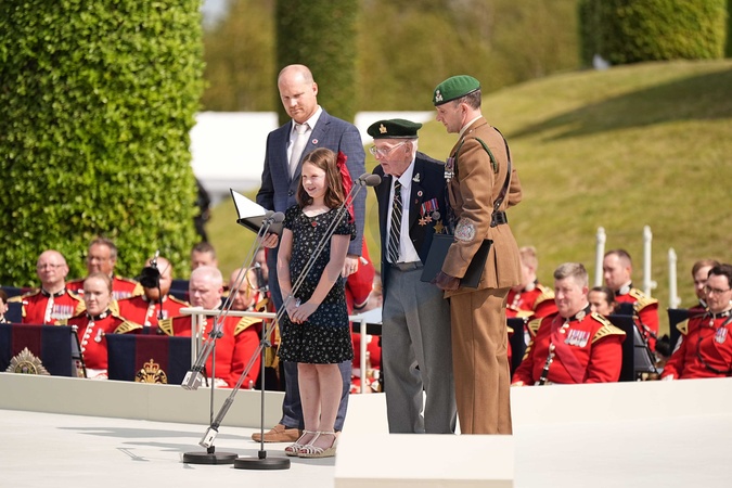 Veteran George Durrant and his great-granddaughter Elsbeth during the national Service of Remembrance, hosted by the Royal British Legion in partnership with the Government, to mark the 80th Anniversary of VJ Day at the National Memorial Arboretum in Alrewas, Staffordshire. Picture date: Friday August 15, 2025., Credit:Aaron Chown / Avalon