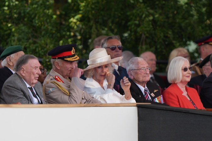 King Charles III and Queen Camilla react to veteran Yavar Abbas's reference to the King's cancer treatment during the national Service of Remembrance, hosted by the Royal British Legion in partnership with the Government, to mark the 80th Anniversary of VJ Day at the National Memorial Arboretum in Alrewas, Staffordshire. Picture date: Friday August 15, 2025., Credit:Joe Giddens / Avalon
