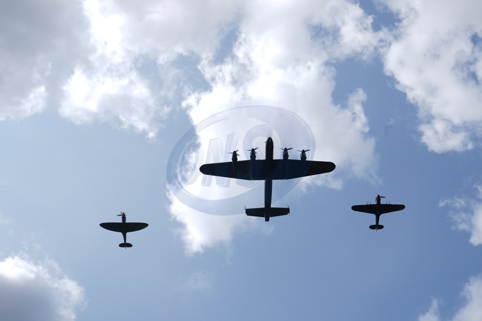 (left to right) a Spitfire, a Lancaster and a Hurricane flypast the national Service of Remembrance, hosted by the Royal British Legion in partnership with the Government, to mark the 80th Anniversary of VJ Day at the National Memorial Arboretum in Alrewas, Staffordshire. Picture date: Friday August 15, 2025., Credit:Joe Giddens / Avalon