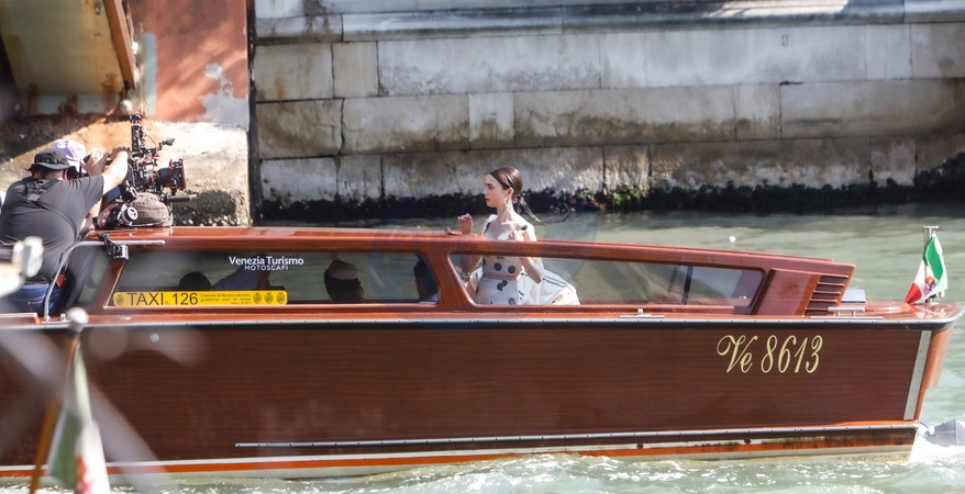 Lily Collins during the filming of the television series Emily in Paris 5, Venice, Italy 19 August 2025
