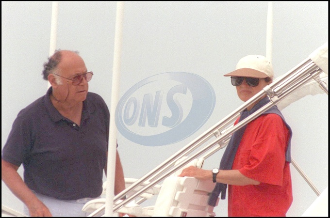 Rétro - Décès du diamantaire belge Maurice Tempelsman, dernier compagnon de Jackie Kennedy-Onassis - JACKIE ONASSIS ET MAURICE TEMPLESMAN SUR UN YACHT A MARTHA'S VINEYARD PLAN SERRE LUNETTES CASQUETTE