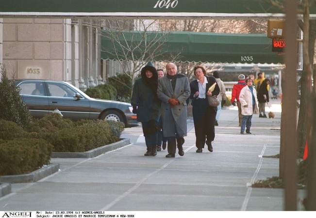 Rétro - Décès du diamantaire belge Maurice Tempelsman, dernier compagnon de Jackie Kennedy-Onassis - JACKIE ONASSIS ET MAURICE TEMPLESMAN A NEW-YORK ILS SE PROMENENT,JACKIE PORTE UN BLOUSON AVEC UNE CAPUCHE,MAURICE UN MANTEAU ET UNE ECHARPE "PLEIN PIED"