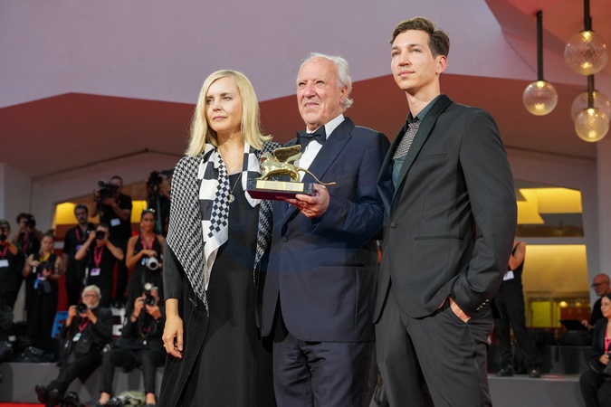 Lena Herzog, Werner Herzog and Simon Herzog posing with Golden Lion for Lifetime Achievement Award after the opening ceremony during the 82nd Venice International Film Festival on August 27, 2025 in Venice, Italy. (Photo by Lucia Sabatelli / Bestimage) EDITORIAL USE ONLY
