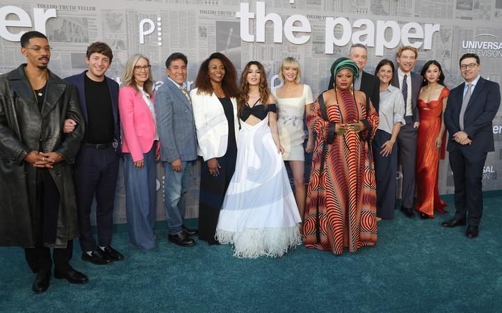 27 August 2025 . Los Angeles, California - Michael Koman, Melvin Gregg, Oscar Nunez, Sabrina Impacciatore, Chelsea Frei, Gbemisola Ikumelo, Domhnall Gleeson, Alex Edelman, Ramona Young, Eric Rahill, Greg Daniels At Universal Television's "The Paper" Series Premiere held at Harmony Gold in Los Angeles., Credit:Sadou Faye / Avalon