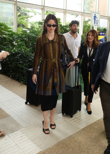 Mia Goth przybywa na lotnisko w Wenecji na 82. Międzynarodowy Festiwal Filmowy w Wenecji (La Mostra)