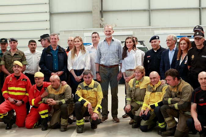 Le roi Felipe VI et la reine Letizia d’Espagne, visitent le centre de coordination du XIVème district forestier de Verín, l'exploitation d'élevage de Cualedro et l'école publique de Medeiros, après les incendies dramatiques