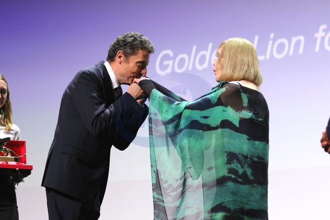 Europe, Italy, Lido di Venezia, September 1, 2025: Kim Novak poses with Golden Lion for Lifetime Achievement Award. Receives the award from Pietrangelo Buttafuoco, President of Biennale. 82nd Venice International Film Festival, on September 01, 2025, in Venice, Italy., Credit:Ottavia Da Re / Avalon