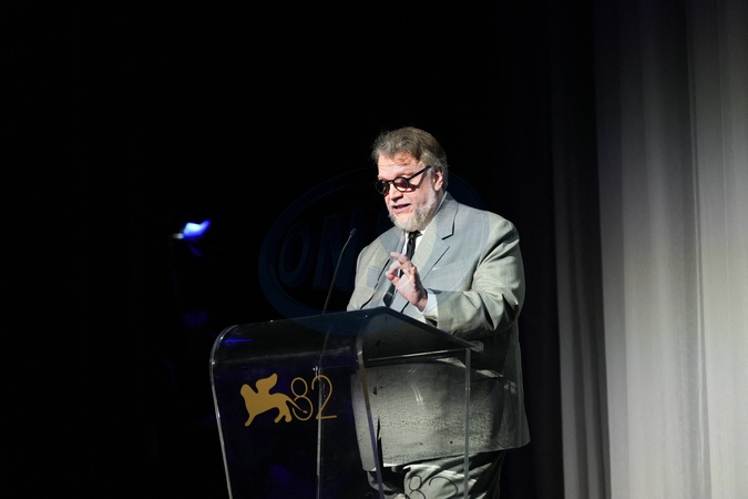 Guillermo del Toro speaks onstage during the Golden Lion For Lifetime Achievement Ceremony during the 82nd Venice International Film Festival on September 1, 2025 in Venice, Italy. (Photo by Lucia Sabatelli / Bestimage) EDITORIAL USE ONLY