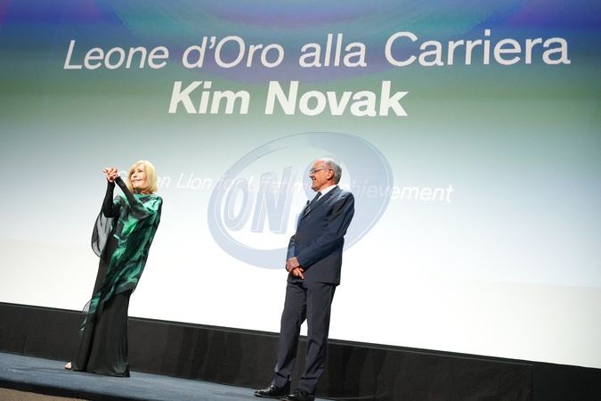 Festival Director Alberto Barbera (R) presents the Golden Lion For Lifetime Achievement Award to Kim Novak (L) onstage during the 82nd Venice International Film Festival on September 01, 2025 in Venice, Italy.(Photo by Lucia Sabatelli / Bestimage) EDITORIAL USE ONLY