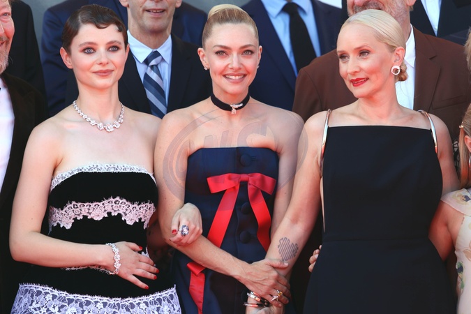 Europe, Italy, Lido di Venezia, September 01, 2025: (L) Thomasin McKenzie, Amanda Seyfried and the director Mona Fastvold attend a red carpet for the movie 'The Testament of Ann Lee' during the 82st Venice International Film Festival on September 01, 2025, in Venice, Italy., Credit:Ottavia Da Re / Avalon